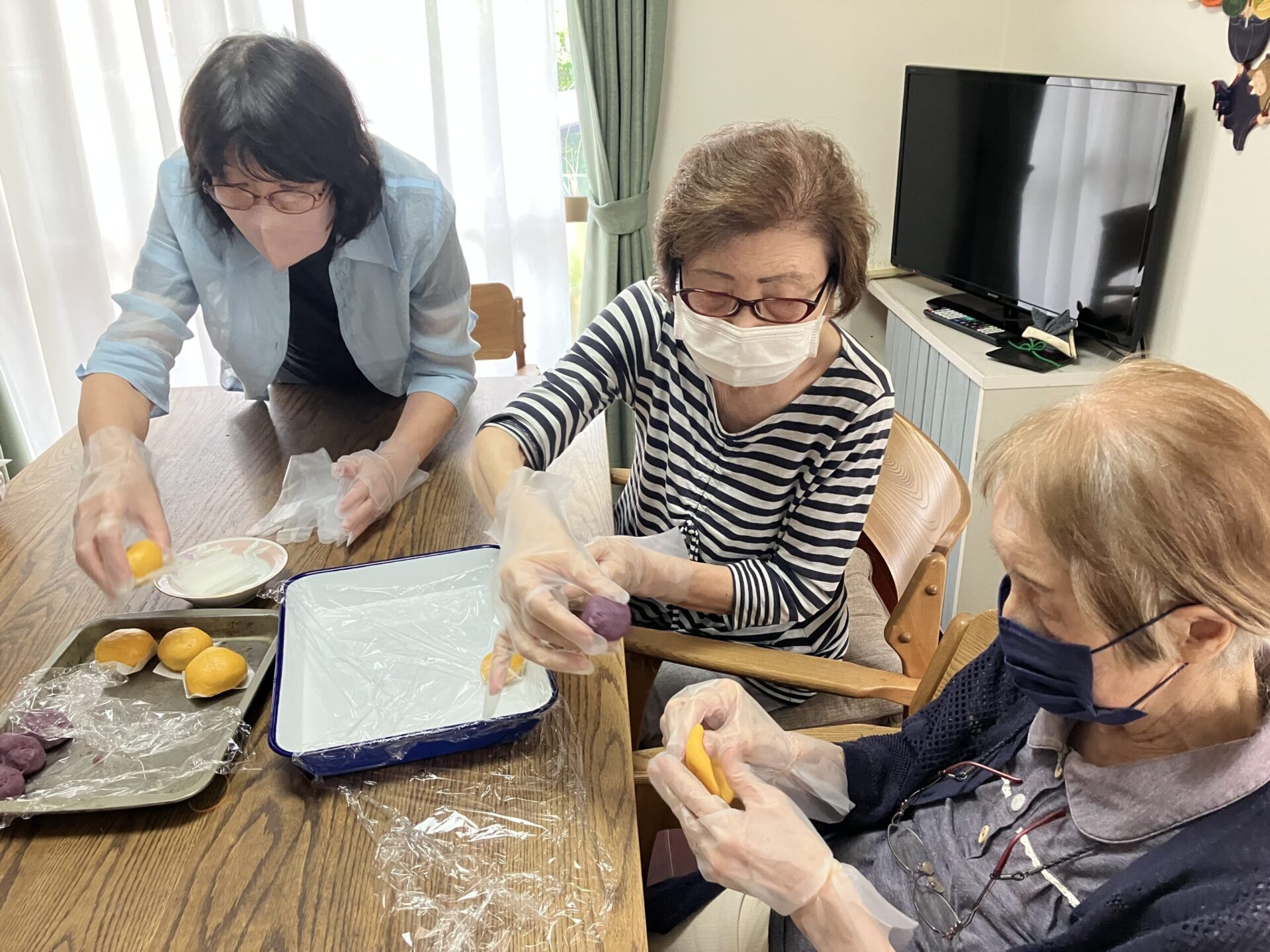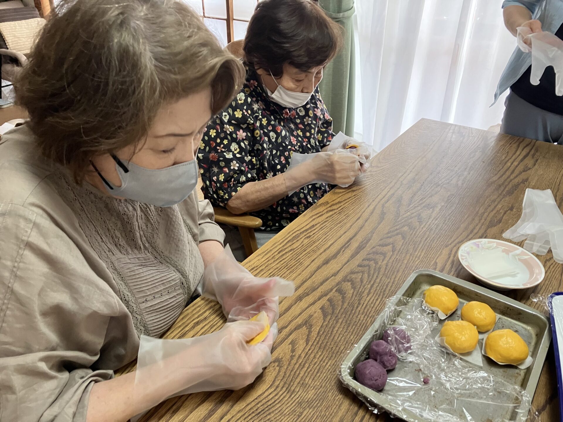 かぼちゃを柔らかく煮て、蒸しパンミックスだけでこねて発酵させて、紫芋の餡を包んで蒸した饅頭を作りました。利用者さんには餡を包んでいただきましたが、「こんなこと初めてした」とか、「昔はよくやってた」とか、とても新鮮だったようで楽しんでおられました。