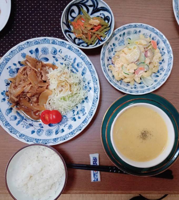 豚の生姜焼き 芋づるの炒め煮(利用者さんがむいた) マカロニサラダ パンプキンスープ