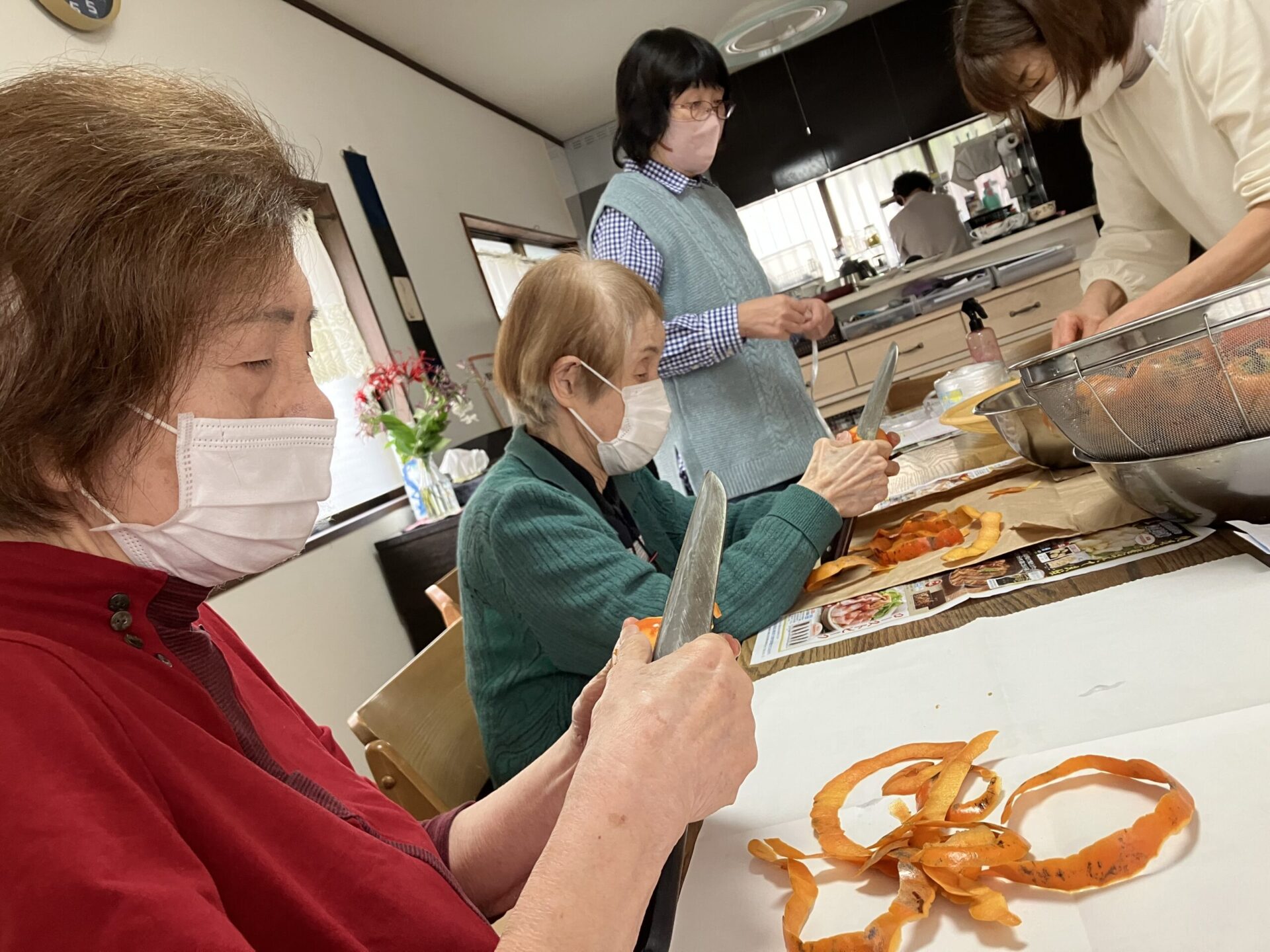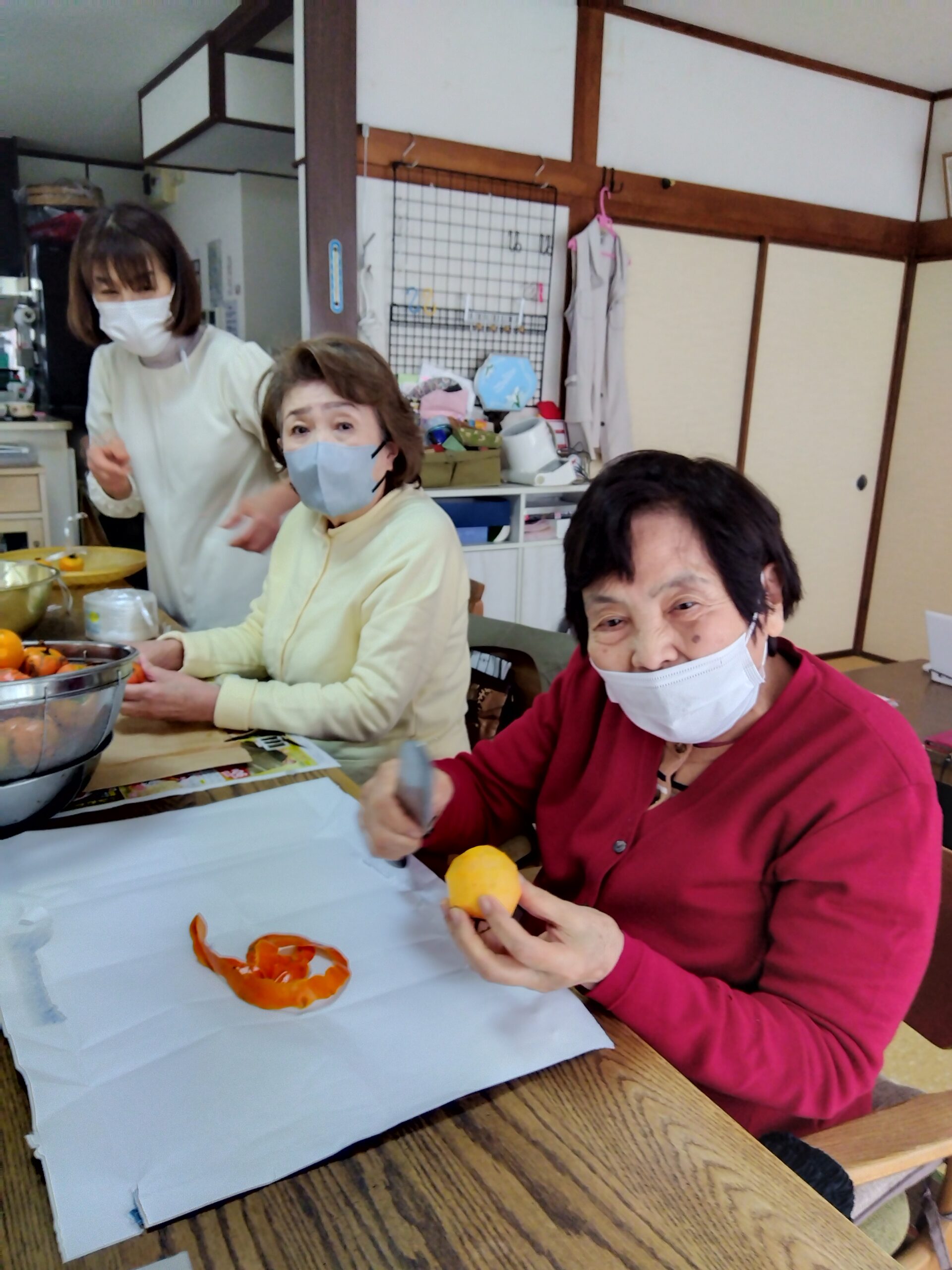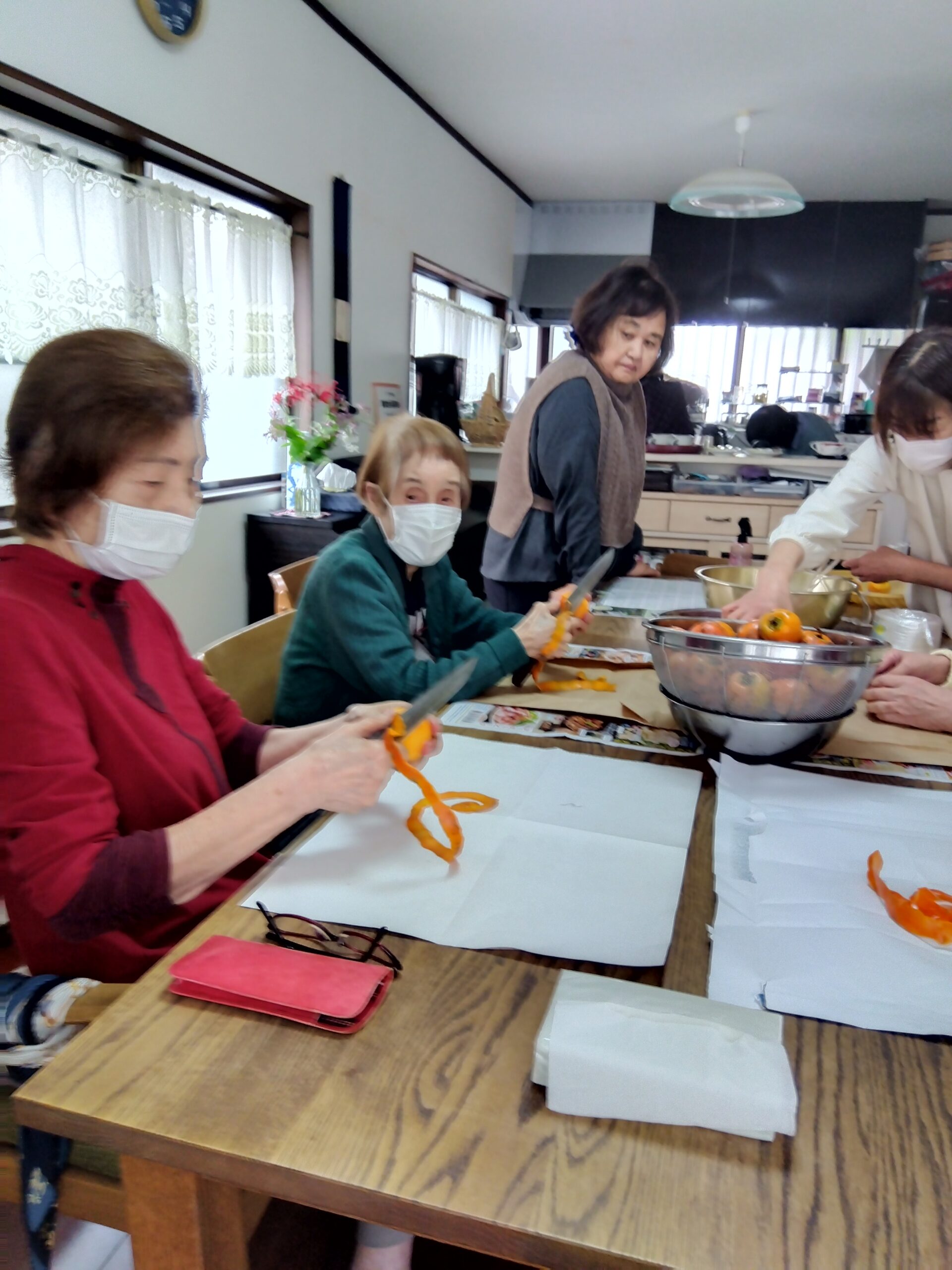 今日は渋柿の皮をむいて軒につるして干し柿づくりをしました。さすが主婦のみなさまは仕事が早く、あっという間に出来上がりました。今から2週間ほどで食べるのが楽しみです。